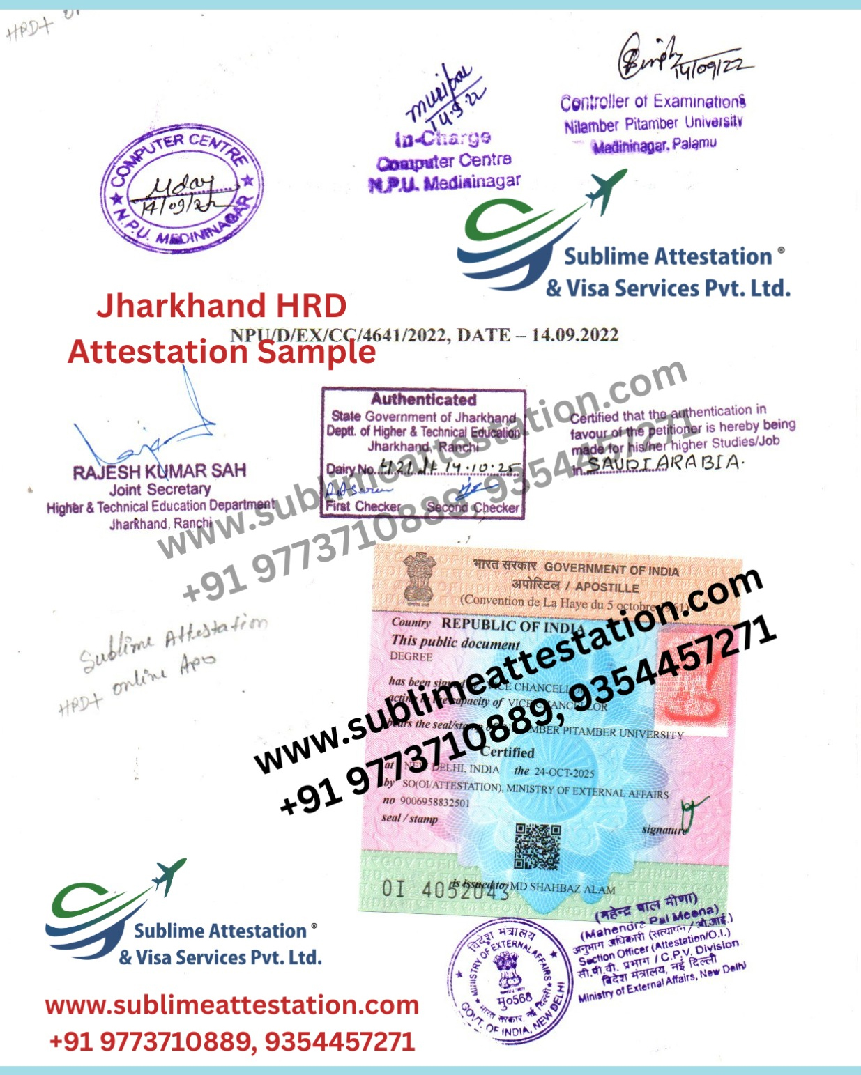 The Human Resource Development (HRD) Attestation is the essential pre-legalization step for all educational documents (degrees, diplomas, mark sheets, etc.) issued by any university or board within the state of Jharkhand, India. This mandatory Jharkhand State HRD Attestation process is performed by the Under Secretary, Higher & Technical Education Dept., HRD Department of the Government of Jharkhand. Its primary function is to verify and confirm the genuineness of the certificate directly from the concern issuing university, ensuring its validity for international purposes.